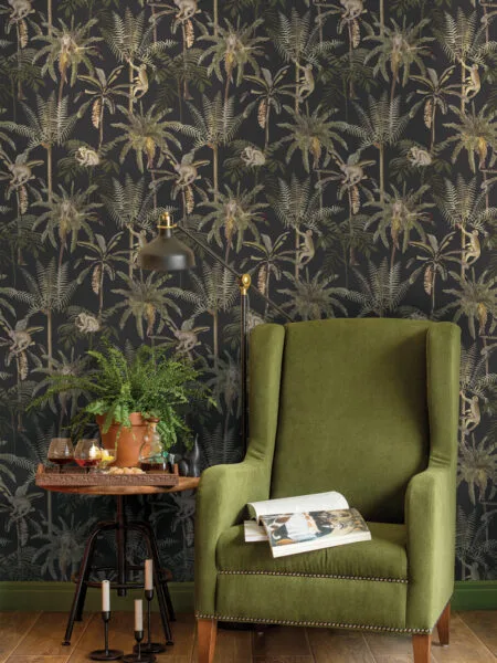 Het patroon van de Arboretum Ateles toont subtiele aapjes die tussen de takken bewegen, wat een speelse, maar tegelijkertijd stijlvolle uitstraling geeft. Dit behang combineert de mystieke charme van het regenwoud met een luxe uitstraling dankzij de donkere kleur en gedetailleerde print. Het ontwerp is zowel geschikt voor een moderne, botanische als klassieke woonstijl en past perfect in diverse ruimtes zoals de woonkamer, slaapkamer, hal of zelfs een stijlvolle kantoorruimte.