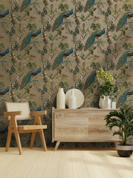 FC Cassia Gold Vliesbehang – Luxueus Behang met Pauwenmotief