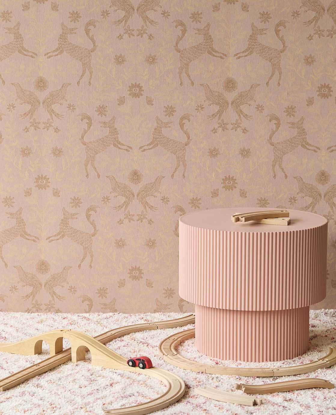 Breng een rustige, natuurlijke sfeer in de kinderkamer met dit verfijnde behang vol bosdieren, vogels en sierlijke bloemen. Het symmetrische patroon en de zachte kleuren zorgen voor een tijdloze uitstraling. Perfect voor een warme kamer waarin fantasie, rust en natuur samenkomen.