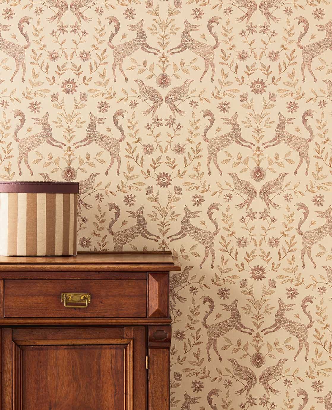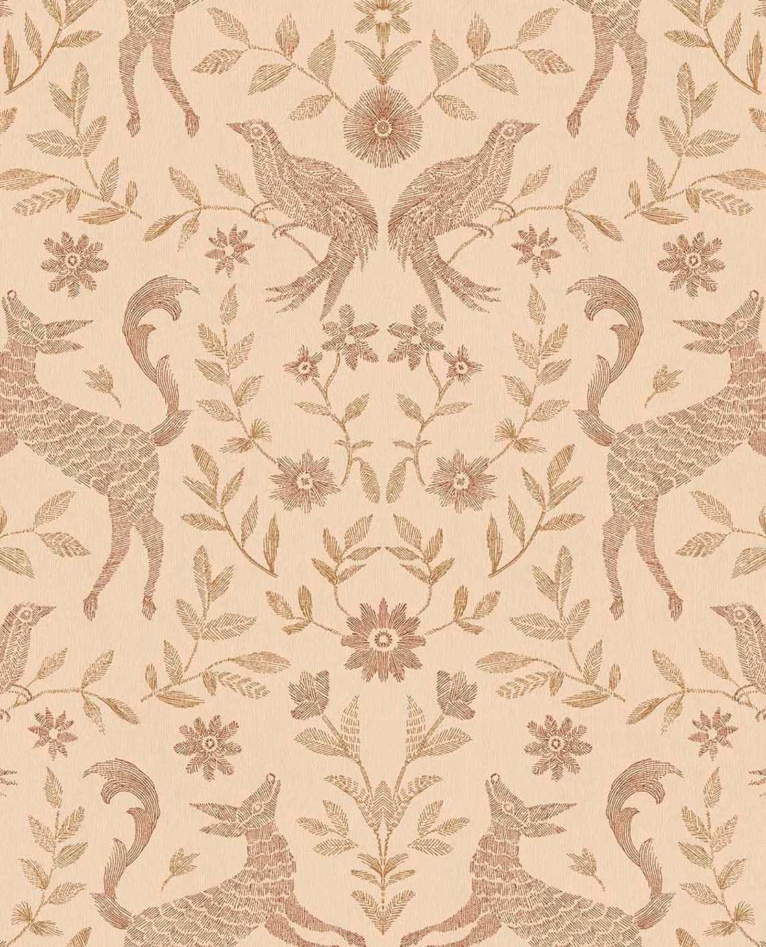 Breng een rustige, natuurlijke sfeer in de kinderkamer met dit verfijnde behang vol bosdieren, vogels en sierlijke bloemen. Het symmetrische patroon en de zachte kleuren zorgen voor een tijdloze uitstraling. Perfect voor een warme kamer waarin fantasie, rust en natuur samenkomen.