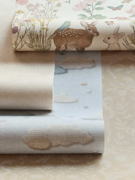 De ontwerpen variëren van subtiele illustraties met natuurlijke elementen tot charmante patronen die doen denken aan gevonden schatten uit een kinderavontuur. Denk aan fijne botanische motieven, kleine dieren, zachte structuren en dromerige kleurenpaletten die rust en geborgenheid uitstralen. De tinten zijn zorgvuldig gekozen om een kalme basis te vormen, terwijl de illustraties genoeg levendigheid bieden om de fantasie te prikkelen. Hierdoor ontstaat een evenwichtige sfeer waarin zowel spel als ontspanning centraal staan.