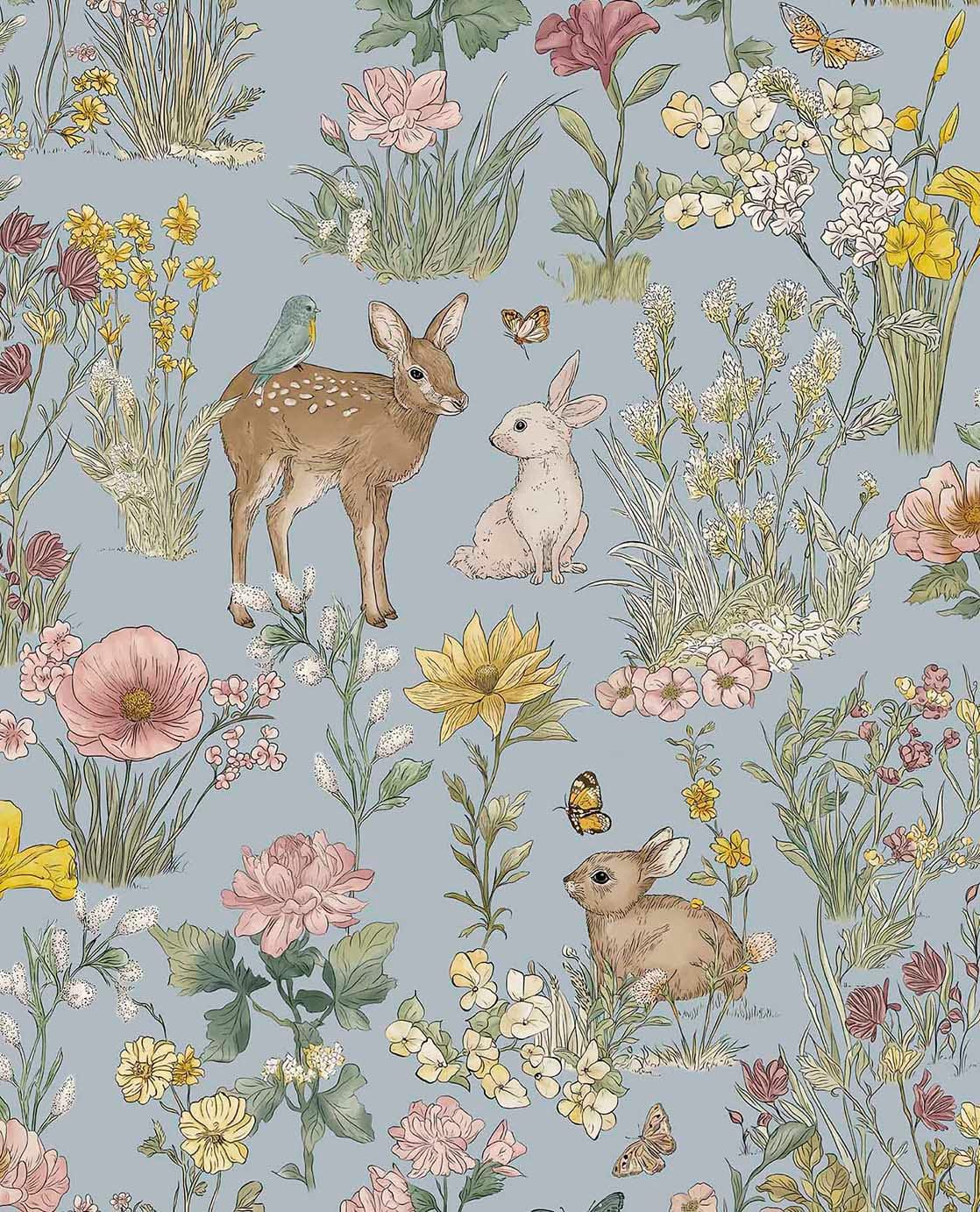 Breng een rustige en dromerige sfeer in de kinderkamer met dit zachte behang vol bloemen en bosdieren. Herten, konijntjes en vlinders verschijnen tussen fijne botanische details. De warme gele ondergrond geeft het dessin een vriendelijke uitstraling en maakt het ideaal voor een natuurlijke, sfeervolle kinderkamer.