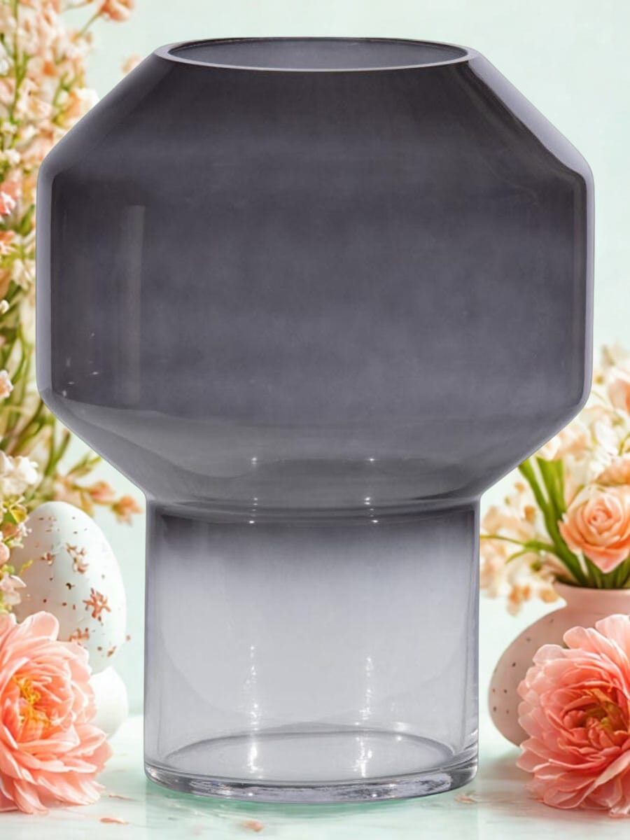 WOOOD Exclusive Jaxx Vaas 26x18x18 cm (bxhxd) is een geometrische, donkere gradiënt vaas uit de collectie van het Nederlandse merk WOOOD Exclusive. De Jaxx vaas is vervaardigd uit sterk safety glass voorzien van zwarte gradiënt die uitloopt in een transparante onderzijde. De opening heeft een diameter van 10,5 cm. Hierna heeft Jaxx een verbreding met geometrisch design met een doorsnede van 18 cm, en loopt in tot ø12 cm. De voet heeft een hoogte van 10,5 cm en het brede stuk is 15,5 cm hoog. Dit maakt dat Jaxx een totale hoogte van 26 cm heeft.