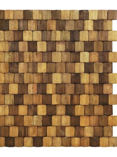 - Structuur: Een compositie van diagonaal gehalveerde kubusvormige stukjes hout (30 x 30 mm) met een getand ontwerp voor naadloze montage.