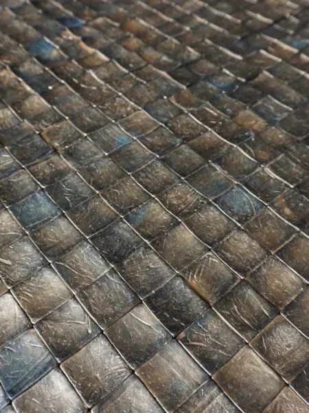 - Materiaal: De Tongkonan is een mozaïek tegel van 420 mm x 420 mm waarbij de afzonderlijke stonewashed stukjes kokosnoot (30 mm x 30 mm) op een kunststof backing verlijmd zijn. Elk stukje van deze tegel is uniek van kleur en structuur en het reliëf is licht hollend.