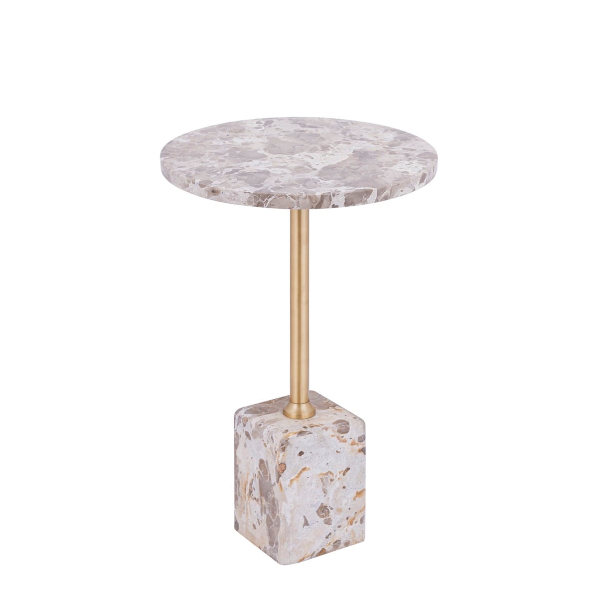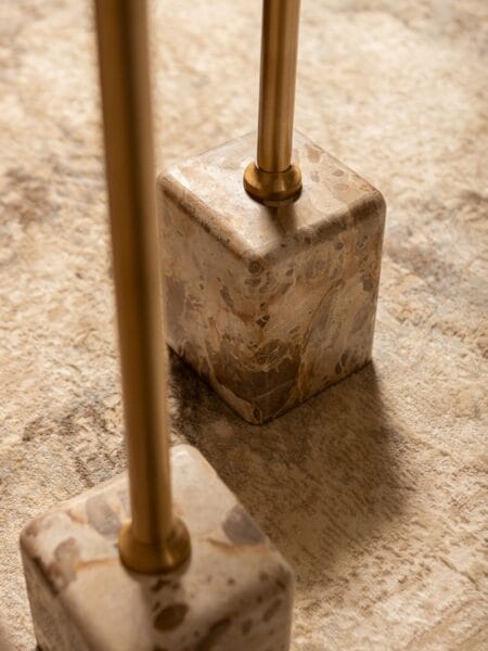 Het ontwerp van de Ebe bijzettafel is elegant en evenwichtig. Het ronde marmeren tafelblad rust op een slanke, metalen poot met een warme goudkleurige afwerking, die uitkomt op een massieve marmeren voet. Deze combinatie van natuursteen en metaal zorgt voor een chique contrast en geeft de tafel een moderne, luxueuze uitstraling. Dankzij de ronde vorm oogt de tafel zacht en verfijnd, terwijl het marmer juist kracht en duurzaamheid uitstraalt.