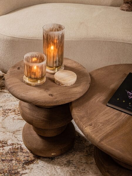 De tafels zijn handgemaakt van hoogwaardig mangohout en hebben een opvallende ribbelvormige voet die zorgt voor een sculpturale uitstraling. Dankzij de natuurlijke houtkleur en ronde vormen passen deze tafels perfect in een warm en modern interieur.