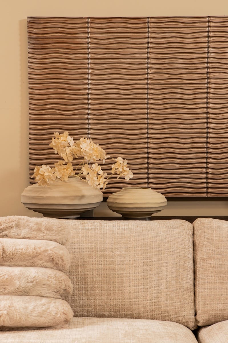De warme bronstint laat zich bovendien uitstekend combineren met natuurlijke materialen zoals hout, linnen en wol, maar ook met metaalaccenten in zwart of goud. Hierdoor kun je het Seline wall panel moeiteloos integreren in uiteenlopende woonstijlen. Of je nu gaat voor een rustige, minimalistische setting of juist een rijk en sfeervol interieur, dit wandpaneel past zich verrassend goed aan.