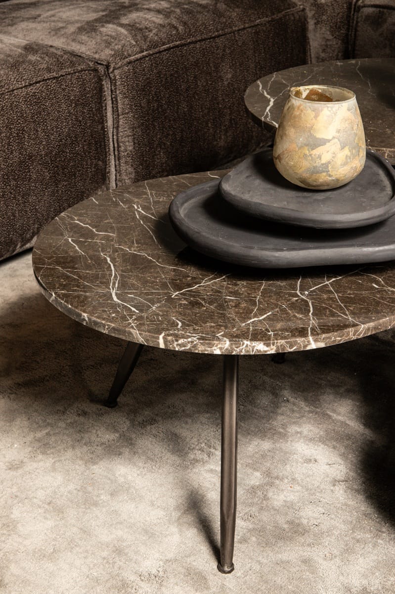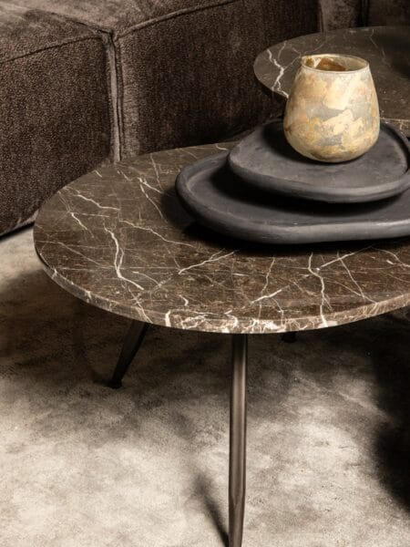 Beide tafels hebben een organisch gevormd blad, wat zorgt voor een speels en natuurlijk effect. De vloeiende lijnen doorbreken de strakke lijnen in je interieur. Ze geven je zithoek een moderne en warme uitstraling. De combinatie van het marmeren blad en de metalen poten maakt deze set tijdloos en stijlvol.