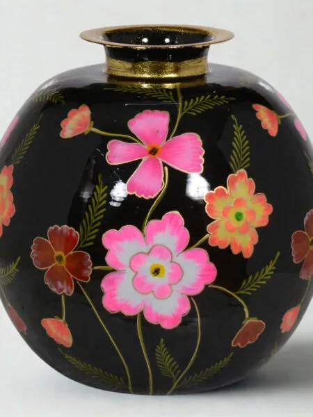 De vaas is vervaardigd uit hoogwaardig metaal, wat zorgt voor stevigheid en duurzaamheid. Elk exemplaar is volledig met de hand beschilderd, waardoor geen twee vazen precies hetzelfde zijn. De ambachtelijke afwerking met een enamel (emaille) laag geeft de vaas een prachtige glans en diepte. De goude basis wordt verrijkt met een speelse combinatie , die het bloemdesign tot leven brengen. Dit zorgt voor een harmonieus evenwicht tussen klassieke charme en moderne luxe.