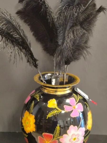 De vaas is vervaardigd uit hoogwaardig metaal, wat zorgt voor stevigheid en duurzaamheid. Elk exemplaar is volledig met de hand beschilderd, waardoor geen twee vazen precies hetzelfde zijn. De ambachtelijke afwerking met een enamel (emaille) laag geeft de vaas een prachtige glans en diepte. De zwarte basis wordt verrijkt met een speelse combinatie van meerdere kleuren, die het bloem- en vogeldesign tot leven brengen. Dit zorgt voor een harmonieus evenwicht tussen klassieke charme en moderne luxe.